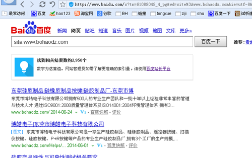 百度對東莞博皓電子的認可,博皓電子官網(wǎng)信息被百度收錄了2950條,一般硅膠制品廠的網(wǎng)站收錄只是500-1000條,較好的硅膠制品廠收錄情況也就是2000-2500條,而博皓電子深受百度的認可,收錄的條數(shù)將近3000條,這里非常的感謝百度經(jīng)常來我們網(wǎng)站。