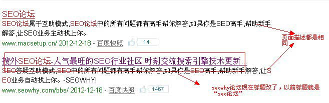 案例一、首先是我們搜索“seo論壇”,排名第一的既然是一個無與倫比的“仿站”,而且仿造的是很沒有水平,logo,頁面描述,關(guān)鍵詞,標(biāo)題,首頁的大致布局,板塊的名稱全tmd的模仿seowhy論壇,如圖: