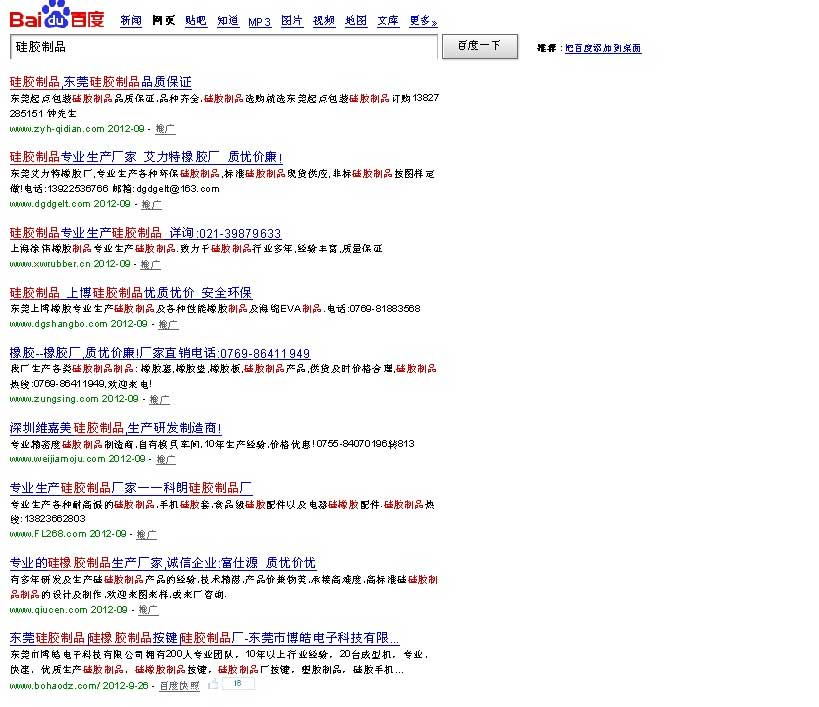 案例二、就是我們博皓電子優(yōu)化的關(guān)鍵詞“硅膠制品”相關(guān)的,進(jìn)入百度搜索框,搜索“硅膠制品”呈現(xiàn)出來的是9個推廣鏈接然后才是正常的鏈接,而且推廣鏈接并沒有和自然優(yōu)化鏈接有明顯區(qū)別,這叫我們seoer的情何以堪啊,雖然我硅膠制品之前是排名第一,但是還是排名第十了,一天一個ip可能都木有,都貢獻(xiàn)給了推廣鏈接,百度你能讓我們相信你嗎?