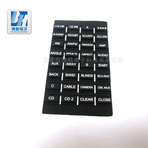 - 產品簡介:該產品適用于儀器儀表按鍵,采用無毒環(huán)保、無污染、優(yōu)質硅膠原材料,左側產品圖片中可以看到這是一款黑色的硅膠按鍵,這是經過博皓專業(yè)配色師父調配而成。按鍵表面的數字以及英文字是采用絲印工藝(絲印白色),全自動化絲印設備,印制過程中位置精確,顏色均勻、使按鍵表面更加平滑,更加完美。博皓電子也可根據客戶需求絲印不同文字以及圖案,還可為客戶開模定制更合適的硅膠按鍵。