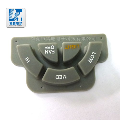 - 產(chǎn)品簡(jiǎn)介:該產(chǎn)品適用于任何儀器設(shè)備儀表等產(chǎn)品,選用環(huán)保無(wú)毒無(wú)污染硅膠原材料,左側(cè)產(chǎn)品可以很清晰看到是灰色硅膠按鍵,這是經(jīng)過(guò)博皓電子專(zhuān)業(yè)配色師父調(diào)制而成。表面英文字是采用絲印工藝,在該產(chǎn)品上面主要絲印了有“白色和黃色油墨”。在該按鍵底部配有導(dǎo)電黑粒,可起到導(dǎo)電效果。博皓電子也可跟客戶需求來(lái)開(kāi)模定制硅膠按鍵,為客戶量身定做更適合的硅膠按鍵。